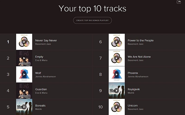 Oli hauska tarkistaa omia kuuntelutilastojaan, mutta tulokset olivat samaan aikaan myös melko yllättäviäkin. En esimerkiksi kuvitellut lainkaan, että olen todella kuunnellut Basement Jaxxin kesällä ilmestynyttä 'Juntoa' todella niin paljon, että sekä bändi että levy ovat päätyneet ykkössijalle. Sen sijaan ei liene yllättävää, että kolme eniten kuuntelemaani genreä ovat jollakin tavalla tekemisissä elektronisen musiikin kanssa, osa ihan suoranaisestikin. Toisaalta tässä viikon mittaan Jussin blogipostauksen kommenttiosiossa on tämän tilaston luotettavuutta ehditty jo ruotia, ja epäilyksiä on herännyt muillakin kuin vain mulla.