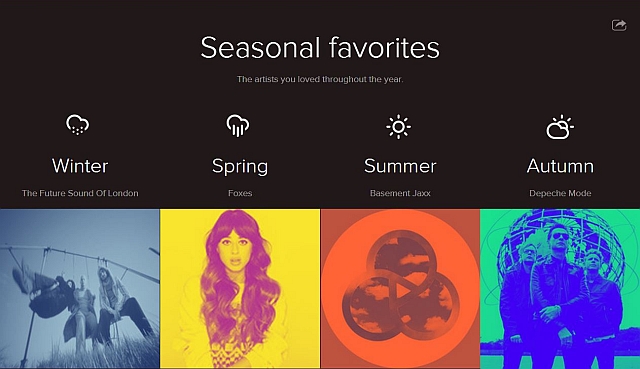 Mutta siis jos tähän voi luottaa, niin toissaviikonloppuun mennessä olen kuunnellut musiikkia Spotifyn kautta yhteensä n. 655 tuntia. Toisaalta olisin voinut kuvitella määrän olevan suurempikin, no vielähän se ehtii kasvaa. My Year in Music -palvelun kautta pystyy näkemään perusgraafien lisäksi myös erilaista nippelitietoa, kuten paljonko vuodenaikojen vaihtelu on vaikuttanut musiikin kuluttamiseeni, kuinka paljon sitä kuuntelen mobiilissä ja kuinka paljon tietokoneella, mistä maista kuuntelemani artistit keskimääräisesti ovat ja minä viikonpäivänä olen kuunnellut niitä eniten.